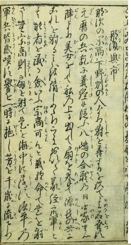 はるか海上の扇を射ち落した弓の名人、那須与市。内海とは言え、多少は波で揺れたでしょうにね。 「早稲田大学図書館古典籍総合データベース」より那須与市(なすのよいち)那須の宗高は下野州の人なり 射を善くするを以て其名発す元暦の兵乱に義経に従ふ 八…